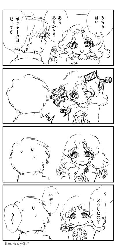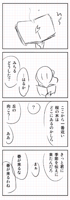しっかりしてください(私が 四コマというかギャグ考えてると、「それ何番煎じ?」と思うことが多くてイヤンです。たぶんこれは七番目くらいだろう知らないけど。ストーリー漫画だとネタが多少被っていても本人の資質差みたいなもんが大きく出るので、怖がることなく描いちゃうんですけど。 ギャグもういっぽんは諦めてサイトの宣伝文句でも乗っけてきます… でも配る相手の8割くらいはうちのこと知ってるんじゃないですか…たぶん… でもまあ2割(※数人です)に宣伝できたらえらいだろう…うん 夜行バスなんかで前日入りする人も居るだろうし、このブログ上で告知するためには時間もないし、ちゃちゃっと終わらせます。がりがり。 全く余談ですが夜行バスって最近スゴいシートがあるらしいですね。時間かかるのに新幹線より高いとか何事。しかしちょっと乗りたい。 拍手ありがとです! |